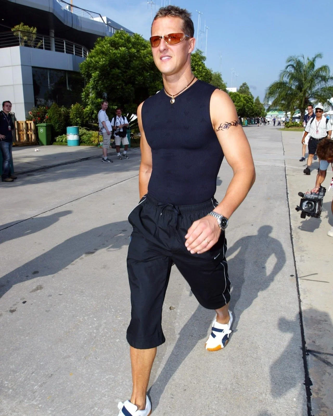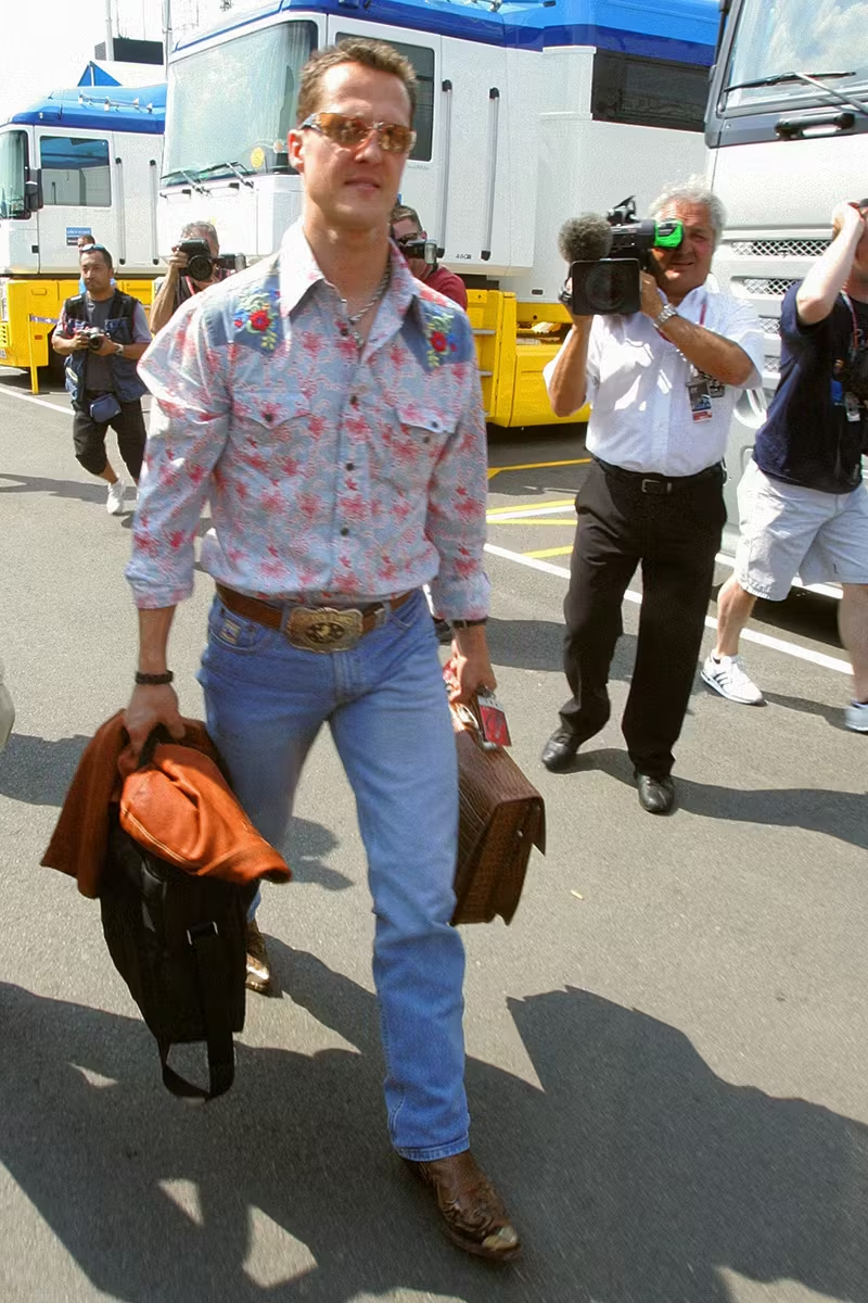 Michael Schumacher also sported some iconic outfits like his fitted black tank top or the cowboy-inspired shirt and chunky-belt combo, some of his signature accessories included choker necklaces and bulky plastic sunglasses.