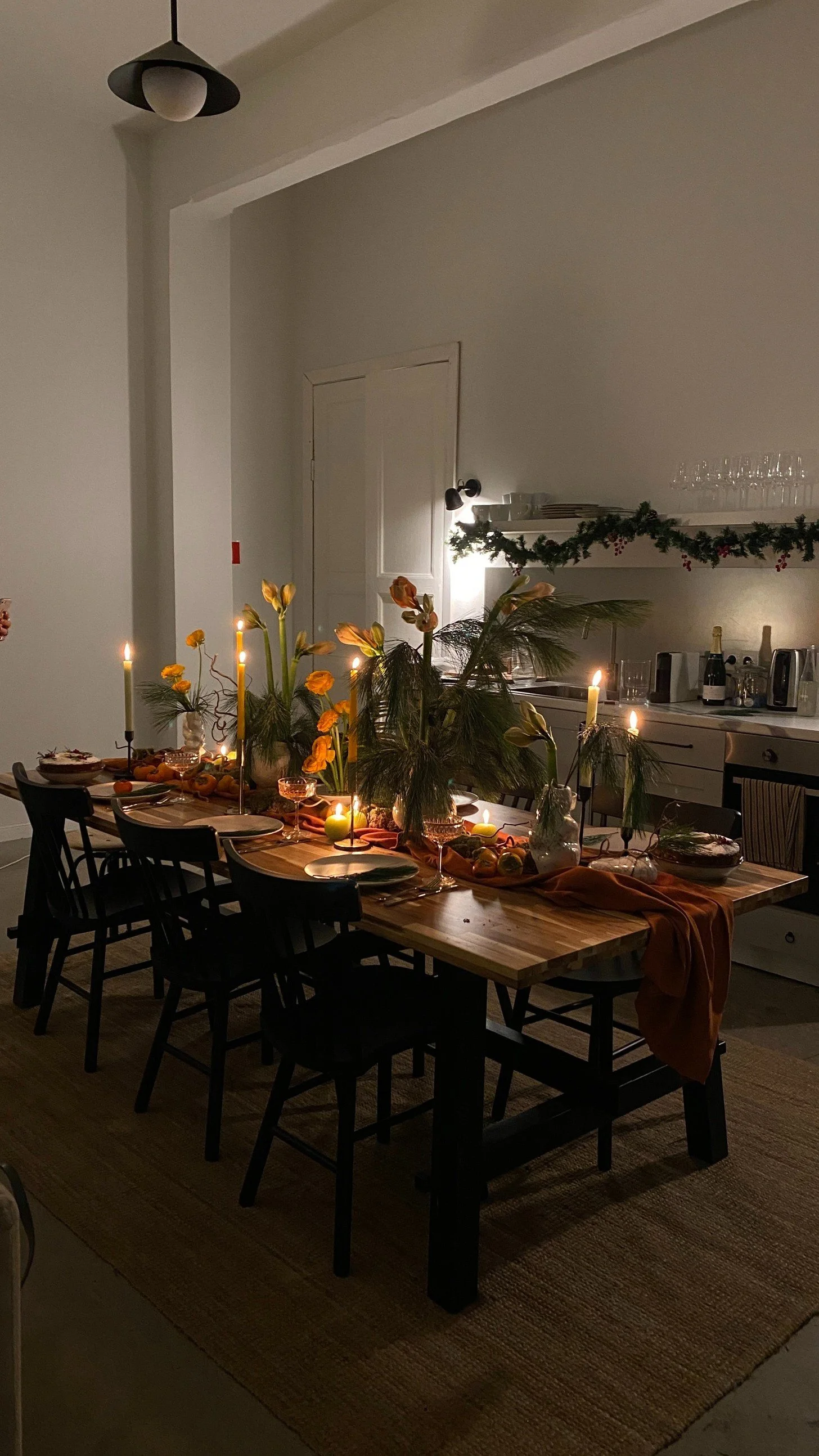 For centerpieces, less is always more. Opt for a low arrangement of seasonal foliage (dried eucalyptus and baby’s breath are foolproof) paired with taper candles for a soft glow. Bonus points if your centerpiece allows room for wine glasses and charcuterie platters—it’s a Friendsgiving, not a wedding banquet.
