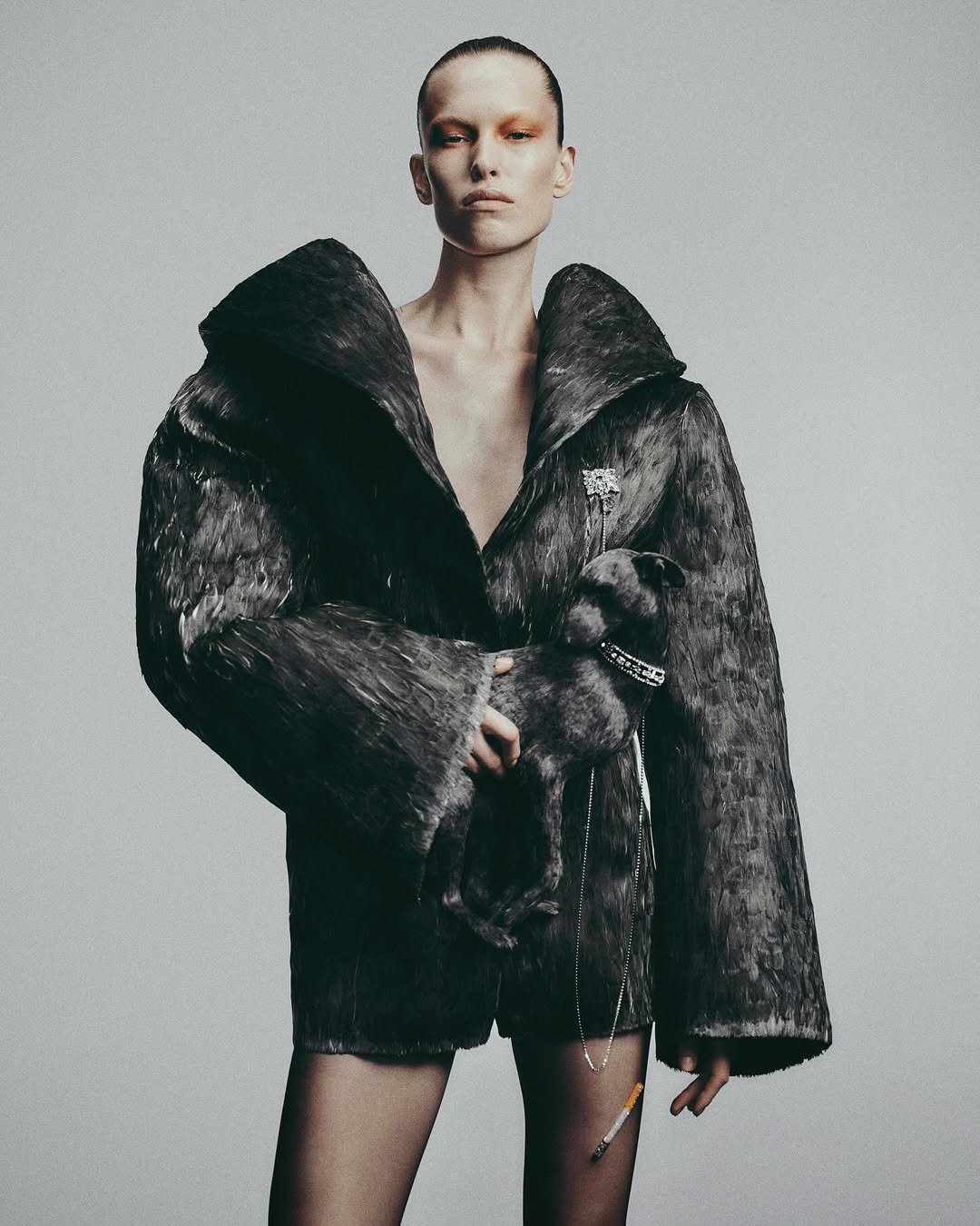 This sculptural logic is most poignantly articulated in Ashi's Velvet Underground collection. Sculptural canines enter directly into the language of the garment, extending his commitment to couture as a contemplative practice rather than a site of spectacle. An ivory shearling coat envelops the wearer's silhouette entirely, cocooning the torso in a dense mass of texture that behaves more like spatial volume than clothing. The coat does not frame the body, it dares to absorb it.